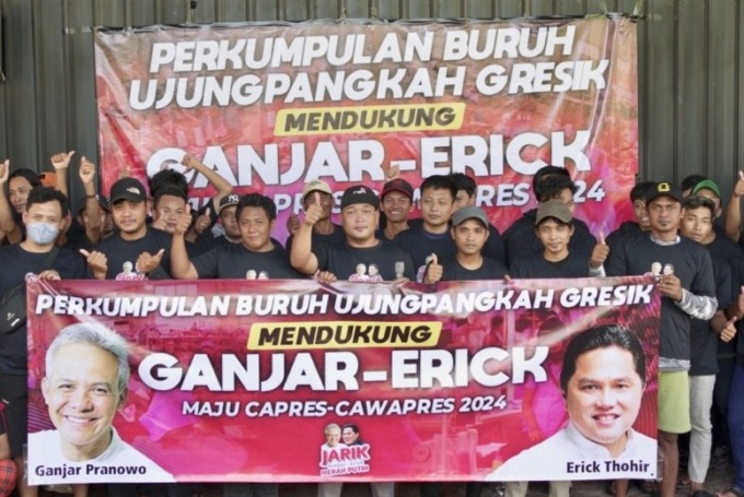 Dukungan kepada kandidat pasangan calon presiden (capres) Ganjar Pranowo dan calon wakil presiden (cawapres) Erick Thohir terus berdatangan. Kali ini dukungan dideklarasikan oleh para buruh pabrik di Gresik, Jawa Timur (Jatim).