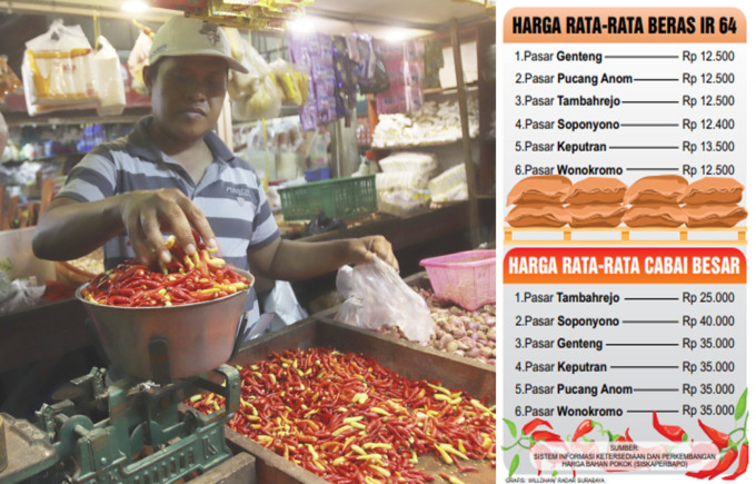 Sudah satu bulan terakhir harga beras IR 64 di Jawa Timur mengalami kenaikan. Namun tidak demikian dengan harga cabai dan telur yang naik turun. Berdasarkan data Sistem Informasi Ketersediaan dan Perkembangan Harga Bahan Pokok