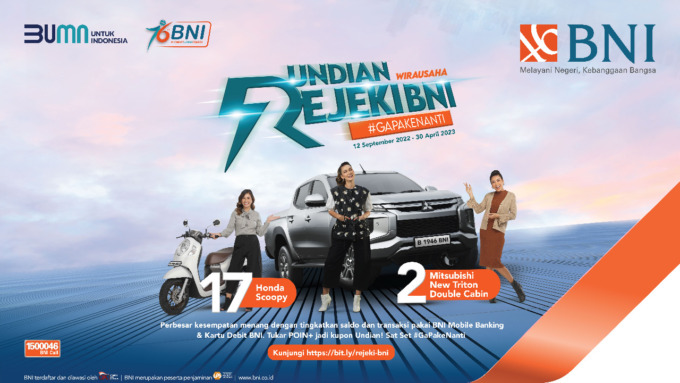 PT Bank Negara Indonesia (Persero) Tbk. atau BNI mengadakan program undian nasional dengan hadiah yang tersebar untuk setiap cabang BNI dengan hadiah undian utama berupa mobil mewah. Program undian bertajuk “Undian Rejeki BNI #GaPakeNanti” ini sudah memasuki tahun kedua setelah program sebelumnya berjalan Tahun 2021-2022.
