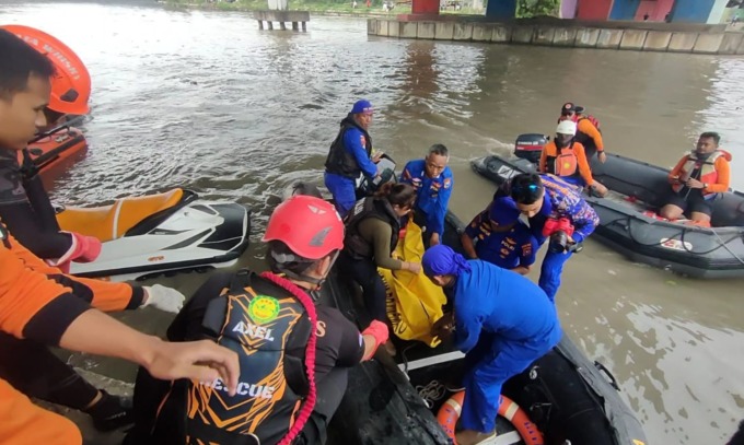 Sebuah perahu tenggelam di tambangan sungai depan Jalan Kemlaten IX, Karang Pilang, Surabaya, Sabtu (25/3). Akibat kejadian tersebut seorang penumpang, Desiree Peni Chindy Khatrine, 23, warga Kemlaten VIII, meninggal dunia.