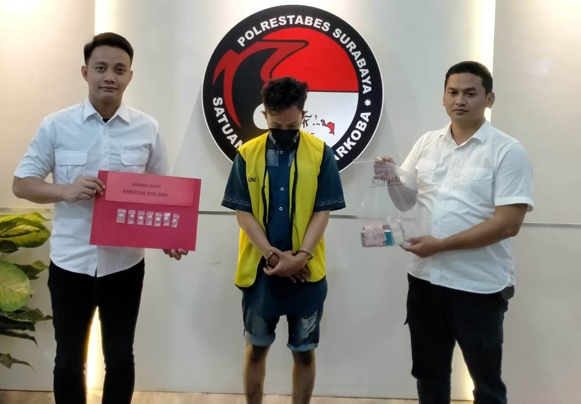 Belum membayar lunas, pria ini sudah tertangkap polisi. Tersangka RH, 26, warga Jalan Petemon, Surabaya, ditangkap Satresnarkoba Polrestabes Surabaya di rumahnya. Petugas menyita barang bukti tujuh poket sabu-sabu (SS) yang disimpan dalam dompet di bawah kasur. Sabu tersebut memiliki berat total 2,94 gram.